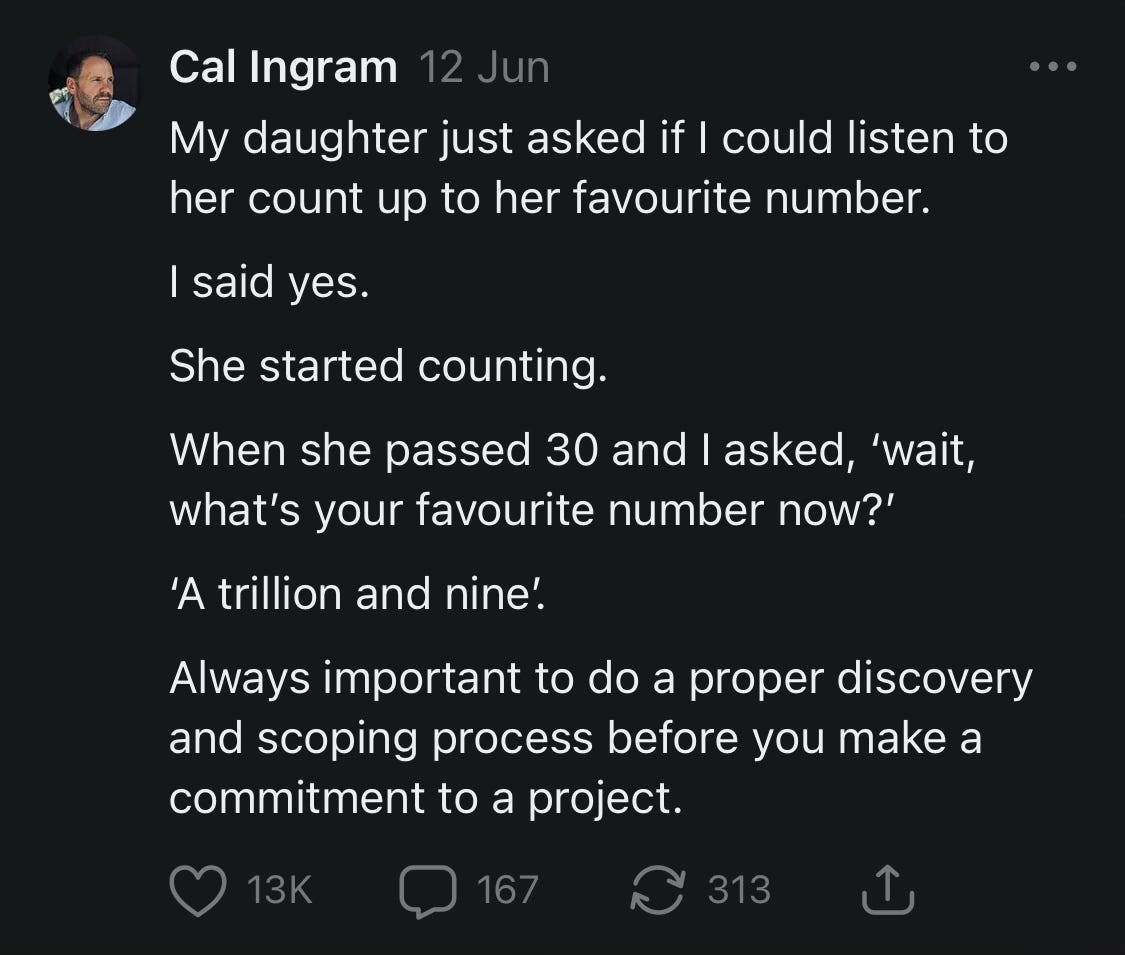 That viral dad story wasn't lifestyle performance or access to my personal life for its own sake. This wasn't a cute parenting moment with business wisdom awkwardly tacked on. The parenting moment was the business insight. A child's naturally shifting goalposts during a simple counting game revealed something profound about how projects expand when you don't establish boundaries upfront.